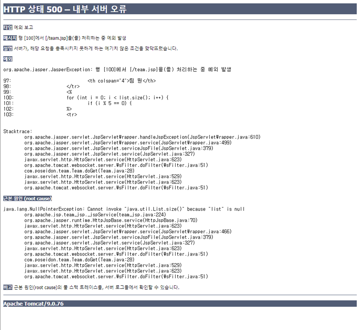 - 팀 접속 → 서블릿 → doGet : Get 방식으로 들어오면 list가 존재하지 않음 (list는 doPost에 있음)